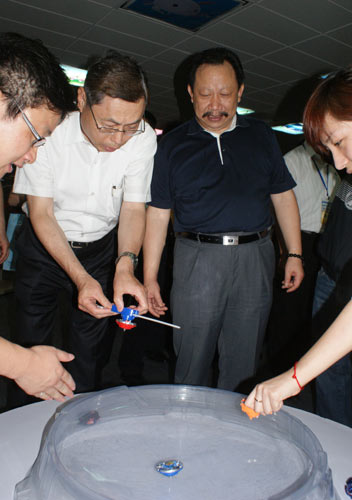 海基会副董事长高孔廉 (左2)试玩杭州中南卡通创作卡通陀螺周边商品。图片来源:“中央社”