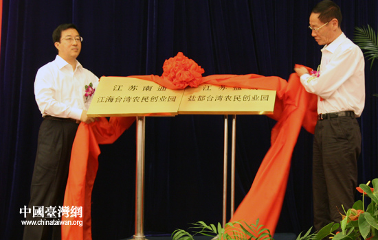 高鸿宾与李维一在开幕式后,为江苏省新设立的两个台湾农民创业园——南通江海台湾农业创业园和盐城盐都台湾农业创业园揭牌。