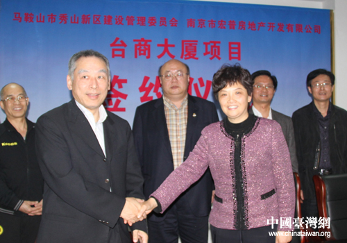 中国台湾网5月3日马鞍山消息 日前,由南京(台湾)明木投资管理顾问有限公司和南京(台湾)宏普房地产开发有限公司共同出资,马鞍山市政府鼎力支持的马鞍山台商兴业大厦在风景秀丽的秀山新区举行了正式的签约仪式。秀山新区指挥长龚玉芝、南京(台湾)宏普房地产开发有限公司董事长段津薪共同在项目书上签字。