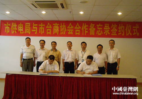 中国台湾网7月3日珠海消息 日前,珠海市台商协会与市供电局在市台商协会活动中心举行了“珠海市供电局与市台商协会合作备忘录签约仪式”,市台商协会陈利星会长与市供电局黄强飞副局长代表双方签署了《合作备忘录》。市台湾事务局局长莫锦华,市供电局市场部主任王洁鹏以及市台商协会常务副会长等参加了签约仪式。