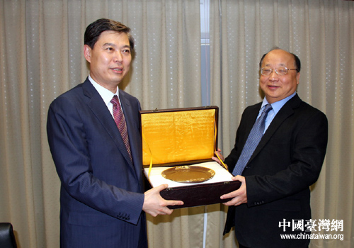 济南市委副书记、市长杨鲁豫与台中市市长胡志强互赠礼物。(图片来源:济南市台办)