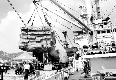 东海岸公共保税仓从台湾进口的水产品在附近的东山港吊卸上岸。