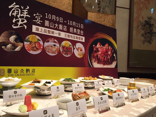 新华网台北10月10日电(记者曹槟)清水大闸蟹、蟹肉松茸盅、菊花对蟹形、蟹黄牡丹虾、蟹露灌虾球……10月9日至15日,上海王宝和大酒店和台北圆山大饭店合作,共同献上“王宝和至尊蟹宴”并举办蟹宴文化节,为宝岛民众带来多道经典蟹味大餐。