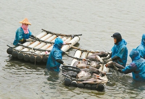 嘉义县养殖业损失惨重,业者柯灯叹冒雨打捞冻死的龙胆石斑鱼。(台湾《联合报》)