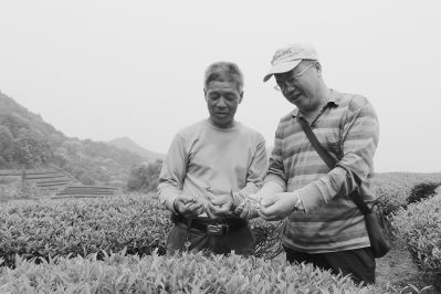 台农曾武宾(右)和员工正在查看茶叶长势。
