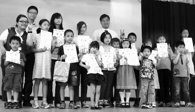 盖梦麟(后中)与在榕举办的两岸儿童公益绘画比赛获奖者合影。