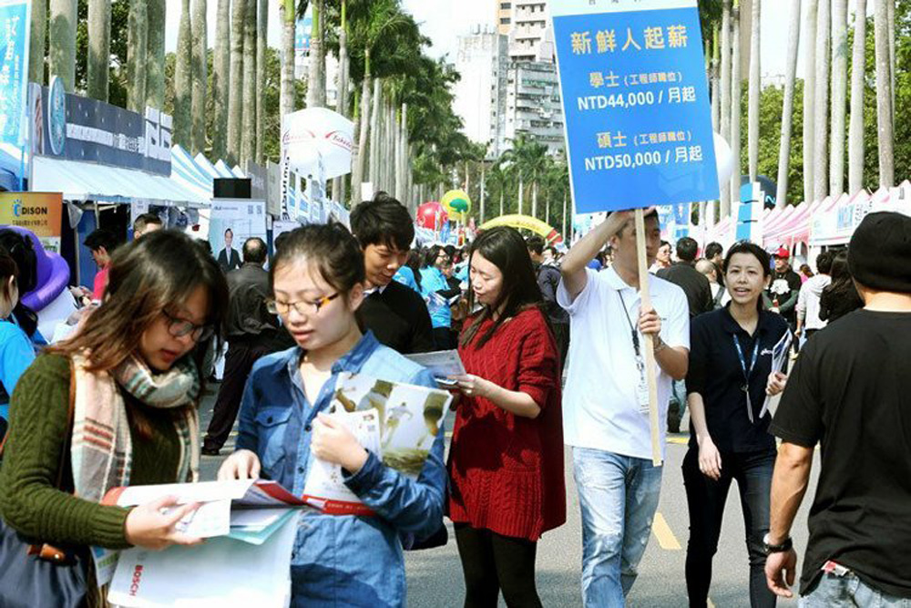 图:台湾大学举办的台大校园徵才博览会上,应聘者在阅读传单 资料图片