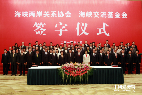 海协会会长陈云林、海基会董事长江丙坤同出席此次商谈的两会代表团成员在签字仪式上合影留念。(中国台湾网 钟宝华 摄)