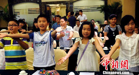 7月1日,在福州举行的“2010·阳光海峡——两岸快乐小天使活动营”的新闻发布会上,福建小营员们张开双手盼望与台湾小伙伴们早日相聚。 中新社发 刘可耕 摄
