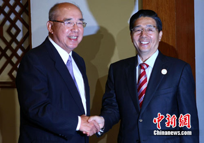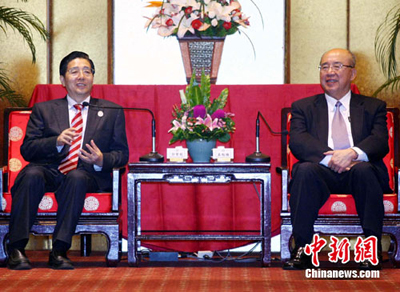 7月1日,中国国民党荣誉主席吴伯雄在台湾圆山酒店拜会中共广西壮族自治区委员会书记郭声琨一行。代表团此行将出席2010年桂台经贸文化合作论坛、举办广西广播电影电视展播周、广西图书展览及赠书活动、桂台农业合作培训班开班仪式及考察自由贸易区等活动。中新社发 宋吉河 摄