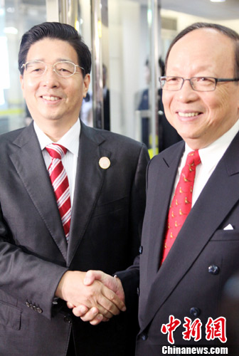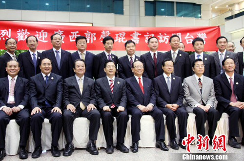 7月1日,应中国国民党中央委员会邀请,中共广西壮族自治区党委书记郭声琨(中)率广西经贸文化代表团,乘包机自南宁飞抵台湾桃园机场,展开为期5天的深化交流合作宝岛行。这是两岸签署经济协议ECFA后,第一位访台的大陆正省级官员。中新社发 黄少华 摄