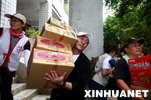 8月15日,李连杰(前左二)在台湾高雄县六龟乡与义工一起搬运救灾物资。