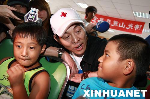 8月15日,李连杰(中)在台湾高雄县旗山镇灾民收容所,与高山族小朋友共唱《我们是一家人》。