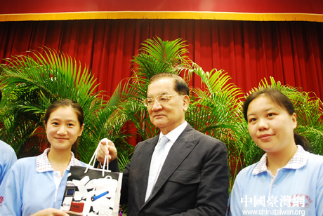 到了连爷爷的办公地,工作人员引领我们坐电梯,来到一间大会客室,我们分坐在两侧,安静地等着。大约12:35,我听见有人说:“连主席来了!”我赶紧准备好照相机,走到门口,只见一位戴着一副眼镜,身穿深色西装,精神抖擞的老人微笑着走进来了。是的,这就是连战爷爷了。我端起照相机拍了起来。只见连爷爷径直走到迎面的沙发坐了下来。这时前面的几个大人挡住了我的镜头,正当我为难的时候,听见连爷爷说:“请各位先闪开一些,让小记者先拍照。”大人们退到了两边,我顿时觉得眼前一亮,连爷爷好细心、好周到啊!只见他稍微整理了一下西装,微笑面对我的镜头。这真是出乎我的意料,刚才的紧张心情立刻放松了,我稳稳地端着照相机,调好焦距,按动快门。连爷爷温和慈祥的神态定格在我的镜头里。现场的气氛马上活跃起来了,同学们似乎也都感受到了这位老人的亲切与真诚。