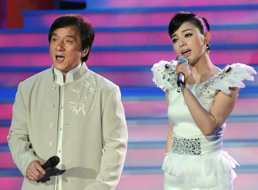 10月31日,陈思思(右)与成龙在演唱会上表演。新华社发(吴景腾 摄)
