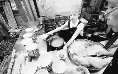 台湾高雄六合夜市一商家的店员正在向游客售卖担仔面。 钮一新摄