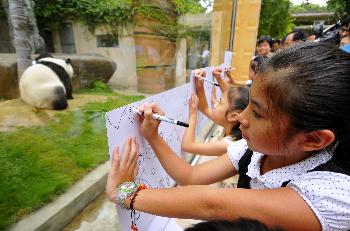 10月10日,台湾南投的小朋友在画大熊猫。 记者 魏培全 摄