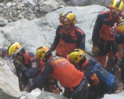 包括台北市和台北县支援的搜救人员,昨天一整天都在苏花公路崩塌处仔细搜索,由于山壁陡峭,垂直近乎90度,搜救人员只能在身上绑着绳索,攀爬梯子缓缓下降到谷底,搜索工作困难万分。