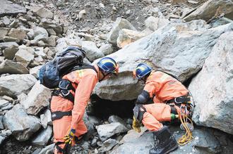 苏花公路114.5公里巨石遍布,搜救人员在石缝中搜寻游览车残骸与失踪游客。