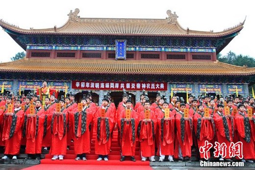 “辛卯年清明海峡两岸共祭炎帝神农氏大典”4月3日在中华始祖炎帝安寝地湖南株洲炎帝陵举行,参加第二届“在台湘籍后裔湖南行”活动的台湾乡亲及社会各界人士共200多人祭拜炎帝神农氏。图为千人颂唱《祭炎帝》。中新社发刘柱 摄