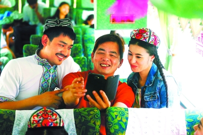 ▲ 在演出地点之间转场动辄几个小时,早出晚归成了文化之旅团员们的常态,而大巴车则成了演员们临时的“家”。一直跟随着演出团四处奔波的当地导游跟着团队看了一场又一场表演,直言自己已经是铁杆粉丝,闲暇时间他还会把自己在观众席上录下的演出视频拿出来回放,请演员们一同欣赏回味。