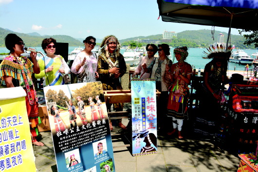 日月潭畔,玄光寺下,邵族杜咪公主文化艺术团尽情放歌,游人可以加入其中乘兴歌舞。