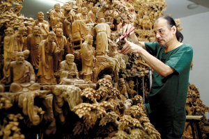 所以现在他已经开始考虑少赚钱甚至是不赚钱,而多做一些能传世的东西。当年他与两百人花了六年时间完成日本无量寿寺的雕刻就给了他很大的启发。“接下来我想做一些比如‘大好河山’之类的题材,把每个省最有代表性的风景名胜刻下来。还有农历新年前会出一本书,详尽地介绍如何分辨木材如何使用刻刀、如何磨刀,分享我三十多年来的经验。”