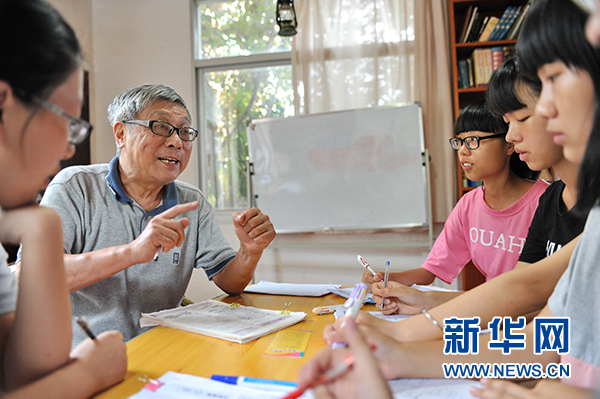 林念生教授在他自家的“免费课堂”里教孩子们学习英语(7月16日摄)。 新华社记者林善传摄