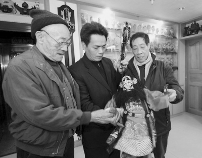 2007年1月8日,泉州木偶大师黄奕缺的两个台湾弟子陈锡煌(左一)、李传灿(右一)和恩师生前制作的钟馗木偶造型合影留念。(资料图片)