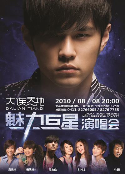 中国台湾网 8月12日大连消息 日前,台湾数名高人气艺人与大陆音乐人在辽宁省大连市金州体育场共同举办“大连天地魅力巨星演唱会”。亮相此次演唱会的台湾巨星团由周杰伦领队,“可爱教主”杨丞琳、袁咏琳、“亚洲女子天团”S.H.E加盟演出。两岸巨星的精彩演出,赢得了在场观众的不断喝彩。