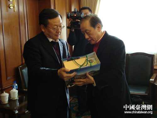抚顺市委副书记喻国伟与台湾新党主席郁慕明互赠礼品。图片来源:抚顺台办