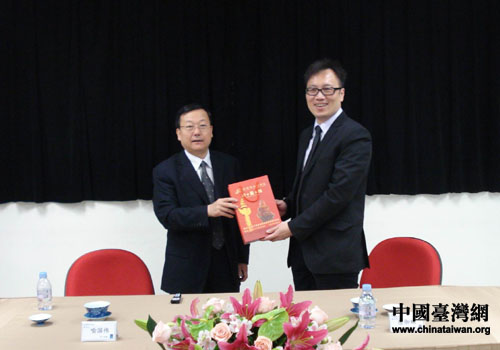 抚顺市委副书记喻国伟向台湾蓝天集团项目开发经理徐御纶赠送礼品。(图片来源:抚顺市台办)