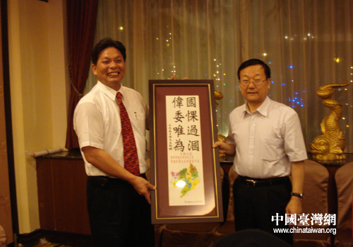 台湾青年企业家交流协会会长向喻国伟赠送纪念品。(图片来源:抚顺市台办)