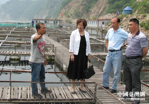 辽宁丹东市台办主任李秀环一行参观养殖基地。(图片来源:丹东市台办)