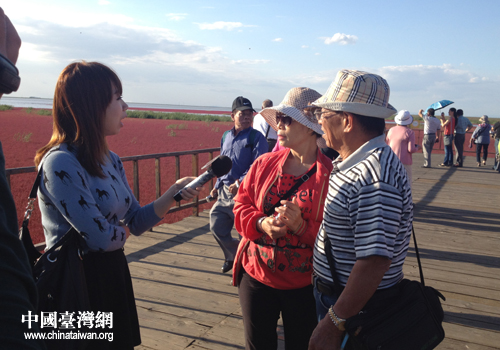中国台湾网9月18日盘锦消息 日前,来自台湾TVBS电视台的两名记者,到湿地之都盘锦拍摄天下奇观——红海滩。拍摄的过程中,主持人廖小姐意外的听到了家乡的口音,原来是来自台湾新竹的游客要到朝鲜去旅游,特意绕道盘锦要看一看红海滩到底是什么样的奇特景观。