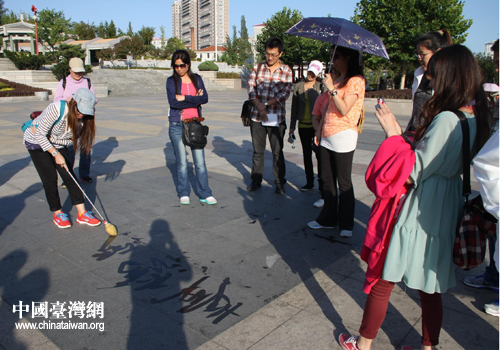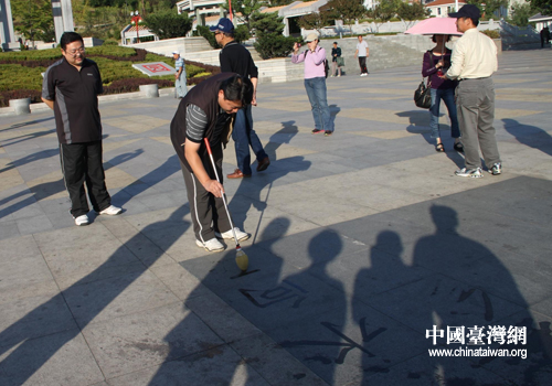 一支长长的塑料笔管,套上一块海绵制作的软软的笔头,就能在地面上一气呵成挥写出刚劲有力或舒展飘逸的草书、行书等各种字体的书法,台湾同胞禁不住也上前一试。“一江春水向东流、台湾……”,台湾同胞专注的神情和一招一式、一笔一画的认真姿态赢得大家的掌声。(中国台湾网丹东市台办通讯员 孙国辉)