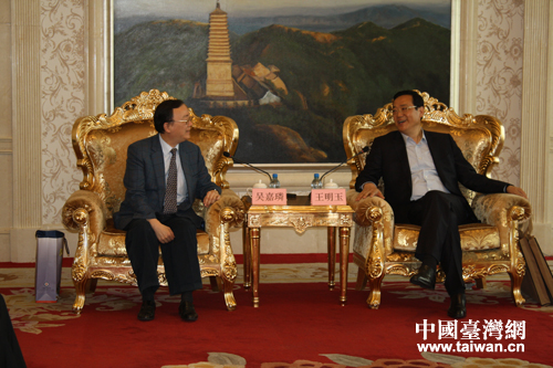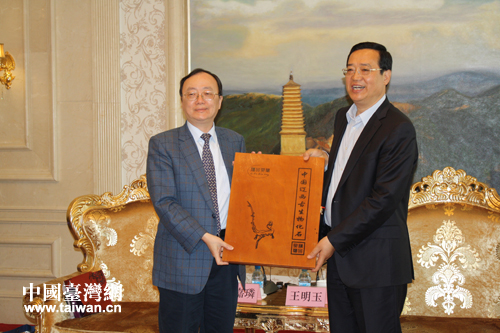 中国台湾网5月13日朝阳消息 5月8日下午,辽宁省朝阳市委书记王明玉、代市长于言良会见了到朝阳市考察的台湾工商建设研究会名誉理事长吴嘉璘一行。朝阳市领导屈连春、花瑞奇会见时在座。