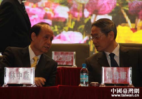 开幕式前,国台办主任张志军与海基会董事长林中森交谈。(中国台湾网 郭庆娜 摄)