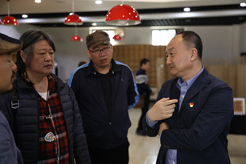 两岸专家进行交流(左二为台湾皮雕大师李荣宗,右一为大连工业大学副校长任文东)。(辽宁省台办供图)
