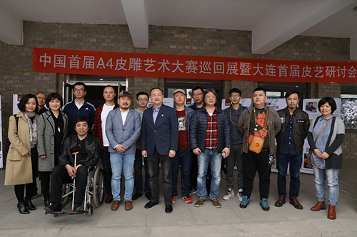 中国首届A4皮雕艺术大赛巡回展与会嘉宾合影。(辽宁省台办供图)