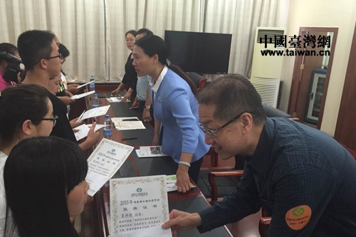 顶新明日朝阳奖学金发放仪式上,腾鸿年理事长为夏祥迪同学颁奖并亲切交谈(中国台湾 芜同摄)