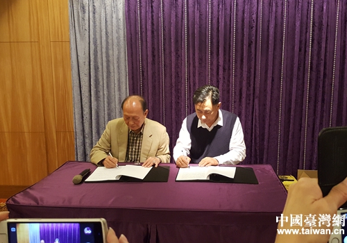 赤峰市工商联副主席钟国文(右)和台湾海峡两岸工商企业协进会理事长刘钧签署商会友好协议