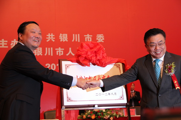 宁夏自治区党委常委、银川市委书记徐广国,全国台企联会长郭山辉共同为“银川滨河新区台商产业园”揭牌