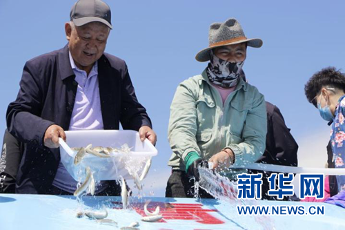 6月6日,当地群众将青海湖裸鲤鱼苗投放到布哈河。新华社记者 周喆 摄