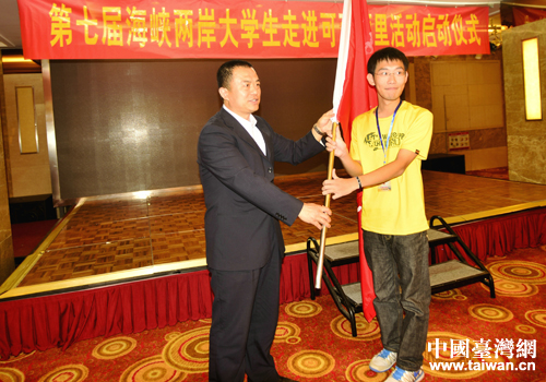 省台办主任赵勇向大学生代表授旗。(图片来源:青海省台办)