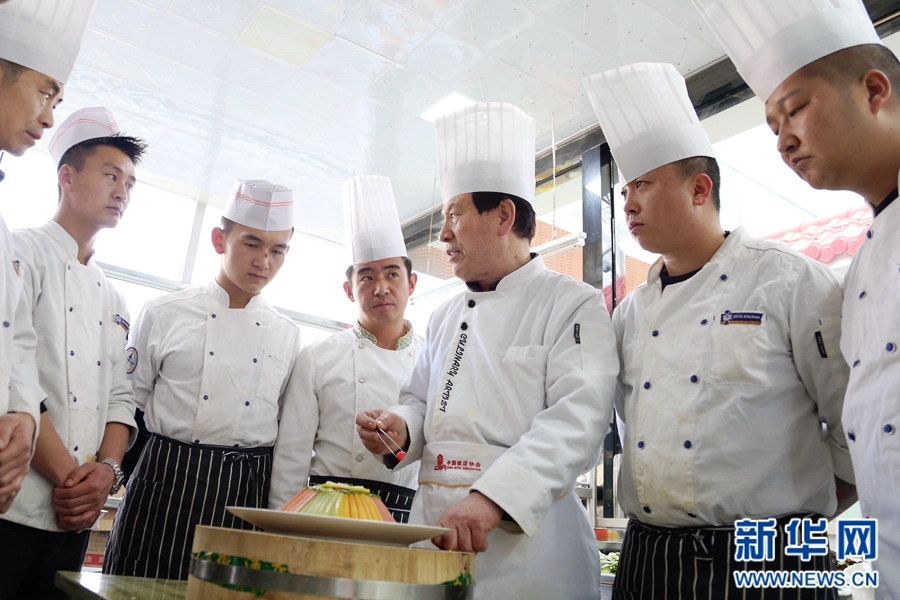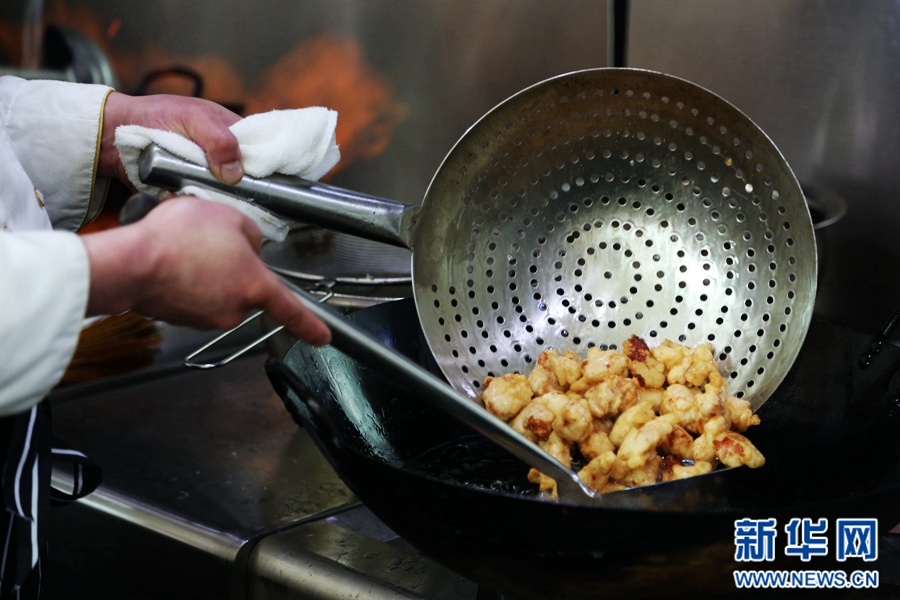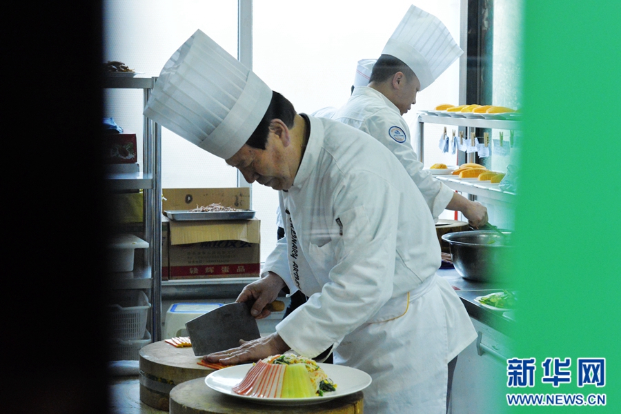 透过橱窗,范增福和他的徒弟们正在厨房里准备食材。新华网 王小龙摄