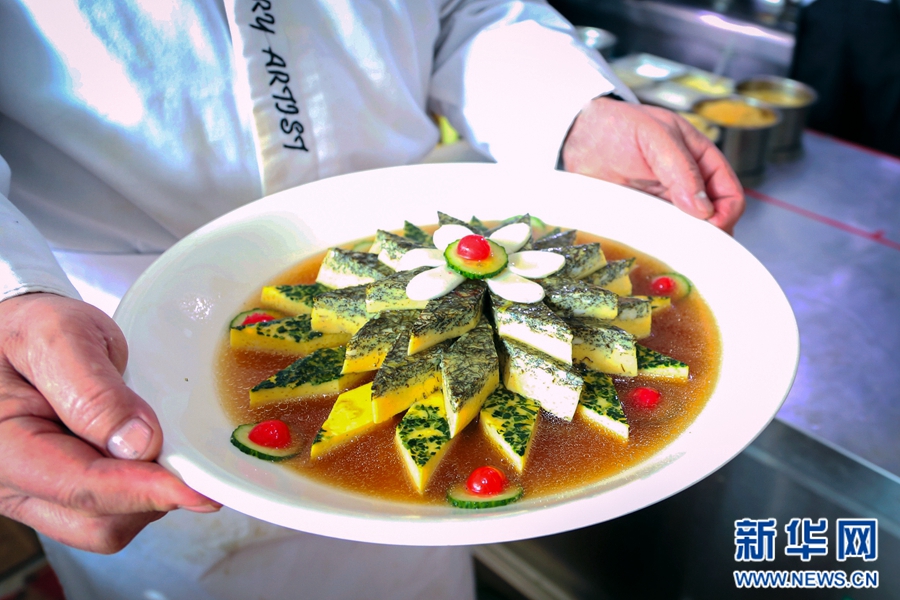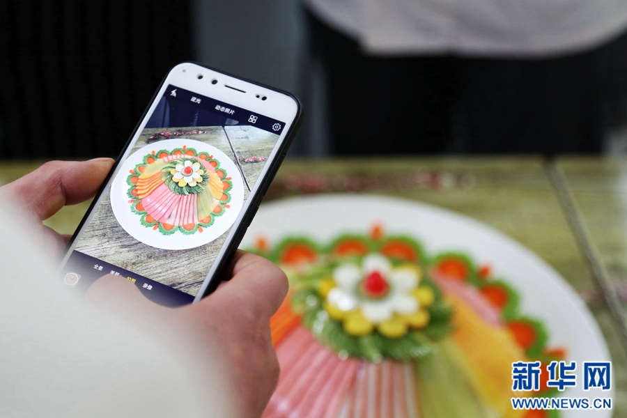 范增福正在细心地摆盘。“全盘的制作非常讲究,拼盘的食材都要切得整齐划一,摆出来才最好看。”范增福说。
