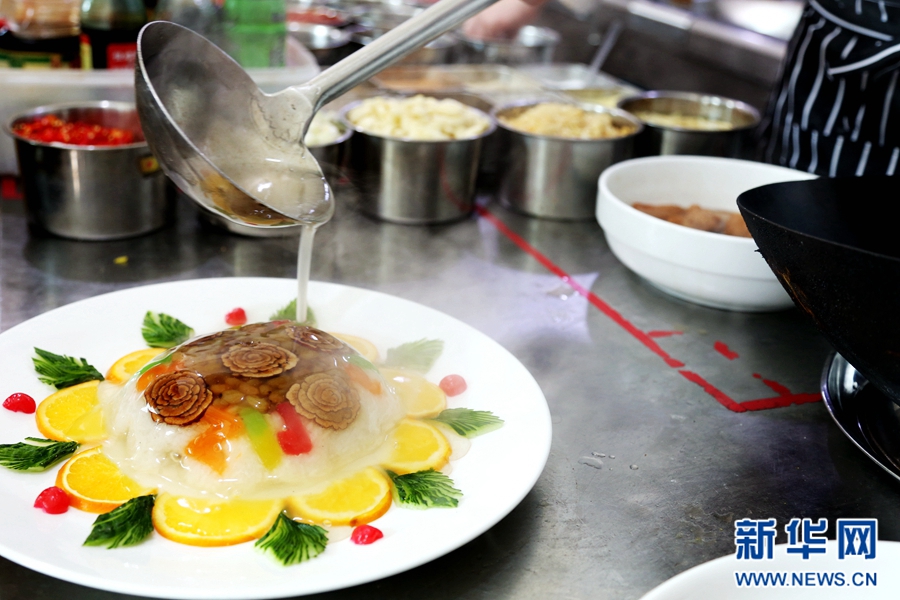 范增福正在给八宝饭浇汁。八宝饭作为“老八盘”中的热菜之一,因其香甜的味道与软糯的口感深受食客们的喜爱。