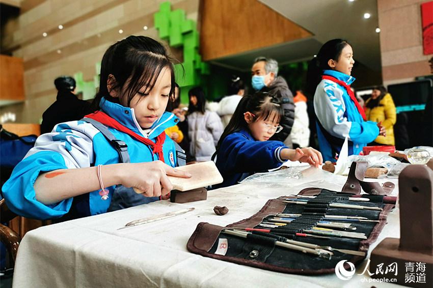 人民网西宁12月15日电(杨启红)“‘泥印薪火 星耀西小’欢迎大家来参观首届西关街小学陶印作品展……”青海省文化馆内,来自西关街小学陶印工作坊的李正宇同学正在给参观者讲解陶印作品,展馆内西关街小学师生们精心制作的一幅幅陶印作品创意无穷。其中以“高原绿、西宁蓝、河湖清”建设行动为内容的一组作品格外引人注目。