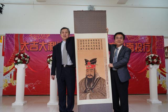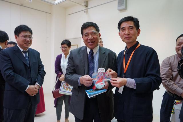 山东省台办副主任曹晓武代表山东省海峡两岸经济文化发展促进会、山东省文物保护与收藏协会向“大哉孔子—圣像·圣迹图展”协办单位南投县政府文化局赠送了特别复制的山东博物馆馆藏《孔子为鲁司寇像》和办展“感谢状”,对南投县政府给予此次文化交流或哦的那个的支持表示感谢。